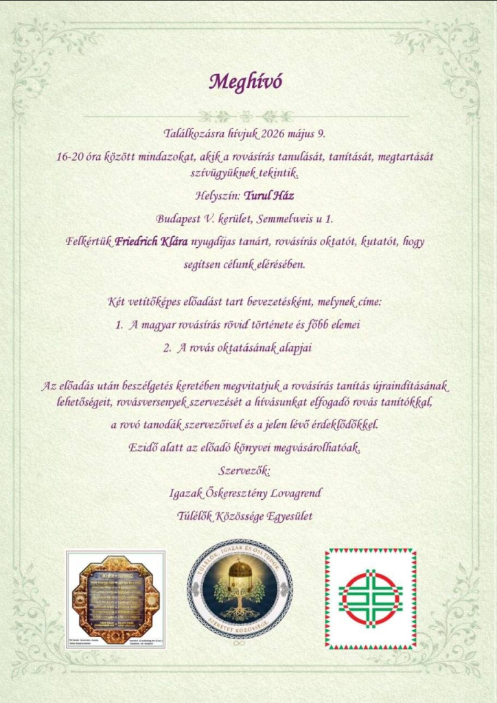 A Túlélők csoporttól Hurai Ágival beszéltem erről a témáról és abban maradtunk, hogy országosan kell a rovás jelrendszer „oktatását” indítani.